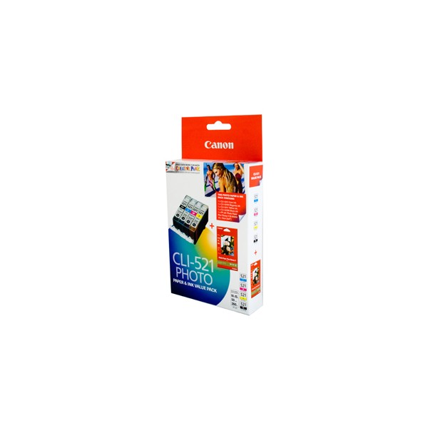 Canon CLI521 Black , Cyan, Magenta, Yellow Ink Value Pack + 50 Sheets of Glossy Paper